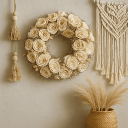 Δημιουργημένο πάνω σε ιδιαίτερη γκρίζα βάση με αποξηραμένους λωτούς, φτερά παγωνιού λευκά και φτερά marabu.
